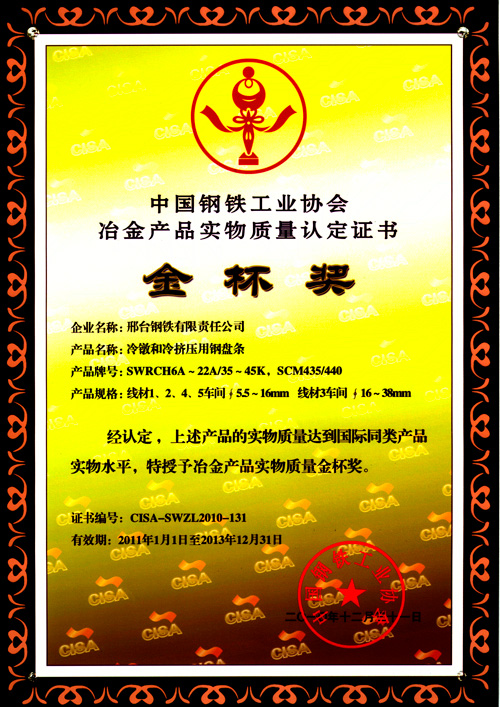 冷鐓和冷擠壓用鋼盤條SWRCH6A~22A/35~45K,SCM435/440獲冶金產(chǎn)品實物質(zhì)量金杯獎