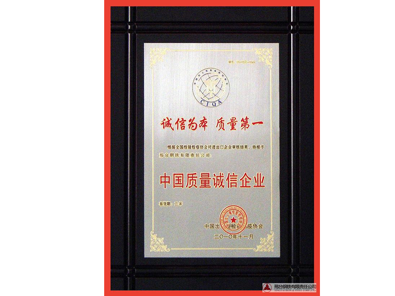 2010年11月,中國(guó)出入境檢驗(yàn)檢疫協(xié)會(huì)授予邢鋼“中國(guó)質(zhì)量誠(chéng)信企業(yè)”。