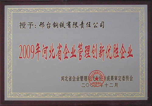2009年12月,邢鋼榮獲“2009年河北省企業(yè)管理創(chuàng)新優(yōu)勝企業(yè)”榮譽(yù)稱號(hào)。