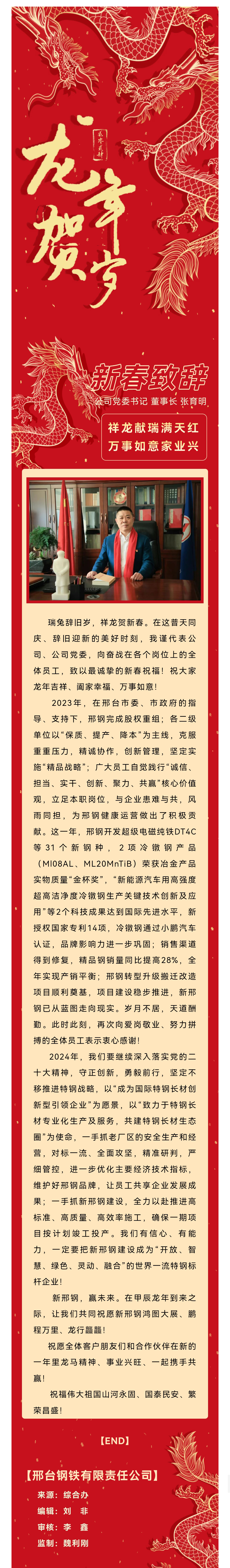 新征程,新起點(diǎn);新目標(biāo),新畫(huà)卷。1月31日,以“新邢鋼,贏未來(lái)”為主題的公司2024年新春聯(lián)歡會(huì)在會(huì)議中心隆重舉辦。黨委書(shū)記、董事長(zhǎng)張育明攜公司全體中高層領(lǐng)導(dǎo)與2023年受表彰的先進(jìn)個(gè)人、員工代表歡聚一堂,共話(huà)邢鋼大業(yè),喜迎龍年新春。