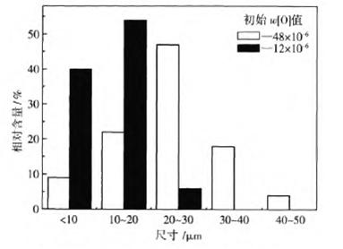 1600℃時,圖1中夾雜物尺寸分別為24μm和11.5μm。鋼中初始氧含量(質(zhì)量分?jǐn)?shù))從48×10-6降低到12×10-6時,粒度為0-10μm和10-20μm夾雜物所占比例成倍增加,粒度為20-30μm夾雜物所占比例降低到5%左右,粒度大于30μm的夾雜物消失。降低鋼水鋁脫氧過程的初始氧含量可降低脫氧溶質(zhì)元素的過飽和度,從而增加鋼中小于20μm夾雜物的比例.