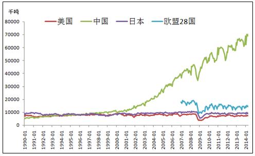 中國是鋼鐵生產(chǎn)大國,粗鋼產(chǎn)量在全球遙遙領(lǐng)先。自2002年開始中國開始進(jìn)入經(jīng)濟(jì)飛速發(fā)展時(shí)期,粗鋼產(chǎn)量一直保持高速增長,到2013年粗鋼產(chǎn)量已達(dá)7.7億噸,約占全球產(chǎn)量的49.1%。美國,日本等鋼鐵生產(chǎn)大國,其對(duì)鋼鐵的需求已經(jīng)放緩,粗鋼產(chǎn)量一直保持穩(wěn)定狀態(tài),所以粗鋼產(chǎn)量的增長大部分來自于中國。(見圖1)