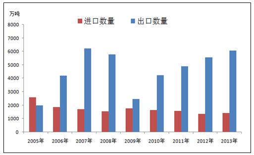 近幾年,中國鋼鐵的進(jìn)口很穩(wěn)定波動(dòng)不大,出口處于穩(wěn)健增長狀態(tài)。出口量增加的原因一是因?yàn)榻?jīng)濟(jì)危機(jī)后各國經(jīng)濟(jì)都在緩慢復(fù)蘇中,主要經(jīng)濟(jì)體制造業(yè)景氣表現(xiàn)出現(xiàn)回升,2014年上半年全球制造業(yè)PMI指數(shù)平均值為52.58,達(dá)到了近兩年來相對(duì)高位的水平。另外新興經(jīng)濟(jì)體對(duì)國家基礎(chǔ)設(shè)施建設(shè)和民用建筑的投資不斷增大,對(duì)鋼材的需求明顯增加;二是中國鋼材價(jià)格相較于其他出口國較為低廉,且近期鋼價(jià)仍在不斷下跌,這增強(qiáng)了中國鋼材在國際貿(mào)易市場上的競爭力。2014年上半年,中國出口量為3930.37萬噸,同比增加1038.37萬噸,同比增幅為35.9%。(見圖2)