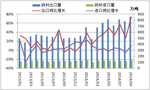 2014年9月我國(guó)出口鋼材852萬(wàn)噸,創(chuàng)下歷史新高,同比大增73.2%。一方面,上年同期基數(shù)較低,導(dǎo)致9月鋼材出口同比增速上升明顯。另一方面,9月我國(guó)鋼材出口均價(jià)加速下跌,國(guó)際競(jìng)爭(zhēng)優(yōu)勢(shì)明顯,進(jìn)一步刺激鋼材出口。當(dāng)月鋼材出口均價(jià)739美元/噸,環(huán)比下降4.9%,同比下降10.7%。