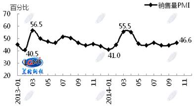 =鋼鐵市場(chǎng)活躍度略有好轉(zhuǎn)。10月銷售量指數(shù)為46.6%,較上月上升2.1個(gè)百分點(diǎn)(見圖3),表明10月份鋼貿(mào)企業(yè)銷售量增加,鋼鐵流通市場(chǎng)活躍度略有好轉(zhuǎn)。進(jìn)入10月,隨著鋼鐵原料鐵礦石及鋼坯價(jià)格的先漲后跌,鋼材市場(chǎng)價(jià)格也呈現(xiàn)先漲后跌走勢(shì),市場(chǎng)成交總體有所好轉(zhuǎn)。從區(qū)域看,六大區(qū)域銷售量指數(shù)除東北、西北地區(qū)有所下降外,其余地區(qū)均出現(xiàn)不同程度的回升。