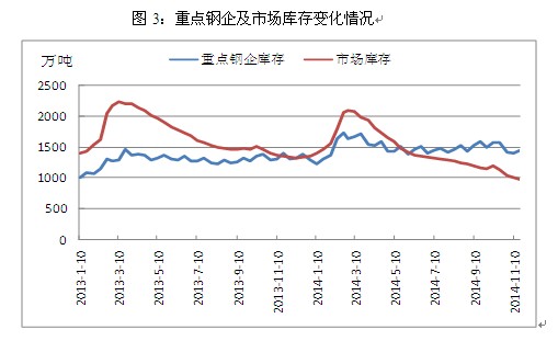 其三,鋼廠經(jīng)營風(fēng)險有所上升。由于近兩年鋼價持續(xù)大幅下跌,市場上的鋼貿(mào)商苦不堪言,相較于家大業(yè)大且有地方政府扶持的鋼廠,鋼貿(mào)商的日子更加難熬,在持續(xù)虧損以及資金壓力下,超半數(shù)鋼貿(mào)商選擇退出。依然活躍于市場的鋼貿(mào)商在操作上也不復(fù)以往的大開大合,小心謹(jǐn)慎成為了多數(shù)鋼貿(mào)商的選擇,由此帶來的直接后果就是市場庫存向鋼廠庫存轉(zhuǎn)移。截止2014年10月末,全國主要城市鋼材庫存約為1043萬噸,較2013年同期相比大幅下降25.7%,與之相反的是,此時重點(diǎn)鋼企庫存增加到1414.3萬噸,較2013年同期上升9.8%,隨著鋼貿(mào)商 “蓄水池”功能的減弱,鋼廠對于價格調(diào)整以及生產(chǎn)策略的變動將更為敏感,但與此同時鋼廠也將承擔(dān)更大的經(jīng)營風(fēng)險。