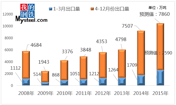 圖表:2008-2015年國內(nèi)鋼材出口量情況及預(yù)測