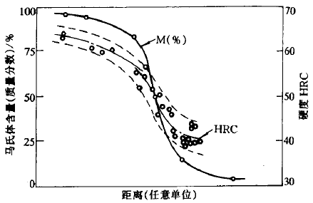 在未淬透的情況下,如何確定工件淬硬層深度呢?從理論上講,淬硬層應為全馬氏體組織,但由于金相組織上淬硬區(qū)與非淬硬區(qū)無明顯界限,而馬氏體量由表面到心部是逐漸減少的。實際上馬氏體中混有一定量非馬氏體組織,如5~10%屈氏體時,在顯微觀察及硬度測量上都不易察覺。因此,通常將具有50%馬氏體處確定為淬硬層邊界,即從工件表面到50%馬氏體區(qū)的距離定為淬硬層深度,因為含50%馬氏體區(qū)是硬度值急劇變化的地方,如下圖所示: