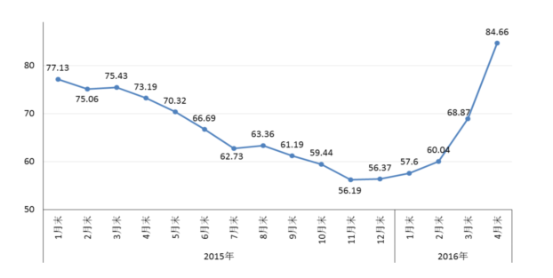 4月末,鋼鐵協(xié)會(huì)CSPI中國(guó)鋼材價(jià)格指數(shù)為84.66點(diǎn),環(huán)比上升15.79點(diǎn),升幅為22.93%,較上月加大8.22個(gè)百分點(diǎn),連續(xù)5個(gè)月環(huán)比上升;同比上升11.47點(diǎn),升幅為15.67%。(見下圖)