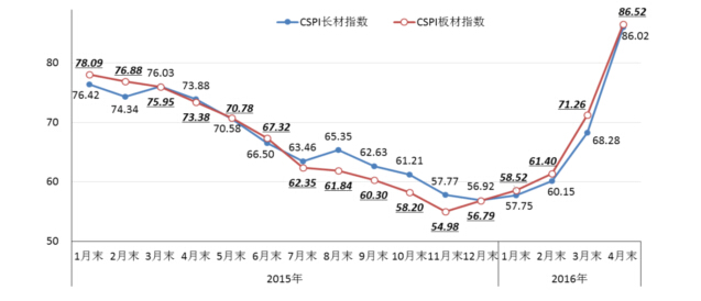 4月末,CSPI長(zhǎng)材指數(shù)為86.02點(diǎn),環(huán)比上升17.74點(diǎn),升幅為25.98%,較上月加大12.46個(gè)百分點(diǎn);CSPI板材指數(shù)為86.52點(diǎn),環(huán)比上升15.26點(diǎn),升幅為21.41%,較上月加大5.35個(gè)百分點(diǎn),比長(zhǎng)材價(jià)格升幅低4.57個(gè)百分點(diǎn);與去年同期相比,長(zhǎng)材指數(shù)上升12.14點(diǎn),升幅為16.43%;板材指數(shù)上升13.14點(diǎn),升幅為17.91%。(見下圖、下表)