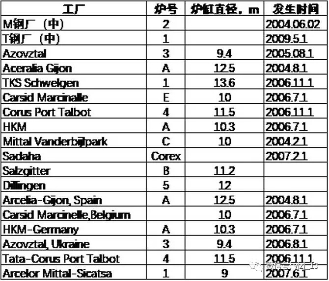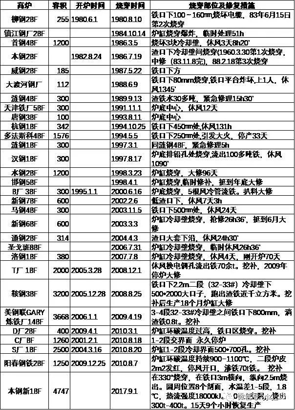 以下針對(duì)國內(nèi)外典型高爐爐缸燒出案例進(jìn)行統(tǒng)計(jì),并對(duì)燒出原因、修復(fù)和維護(hù)等方面進(jìn)行詳細(xì)的說明,為國內(nèi)外高爐的長(zhǎng)壽提供技術(shù)和數(shù)據(jù)參考。