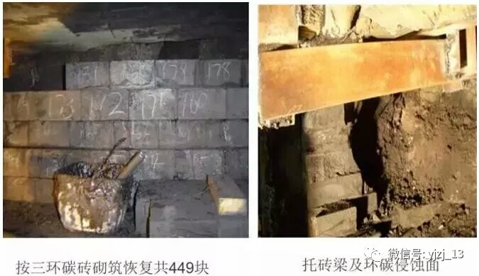 利用工程剩余的UCAR炭磚重新砌筑,部分炭磚需要現(xiàn)場(chǎng)加工外型,縫隙采用炭質(zhì)泥漿。總計(jì)砌筑11層,449塊炭磚。