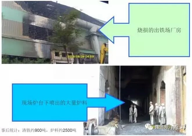 事后確認(rèn):4#鐵口下方爐缸燒穿,大量渣鐵和炙熱的爐料(焦炭、礦石)噴出,現(xiàn)場(chǎng)燒損嚴(yán)重(新3高爐本體電纜、煤粉噴吹總線電纜、新2高爐電源電纜、計(jì)量?jī)x表電纜、出鐵場(chǎng)天棚、4#爐前炮、開口機(jī)、東場(chǎng)及北場(chǎng)爐前吊車、爐前休息室、電梯等燒損。)