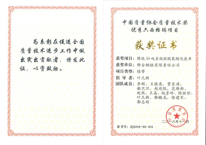 為推廣應用六西格瑪?shù)膬?yōu)秀成果,交流、學習先進典型,促進六西格瑪項目水平的提升,邢鋼參加了2018年中國質量協(xié)會質量技術獎六西格瑪優(yōu)秀項目申報。近日獲悉,公司申報的兩個六西格瑪項目,均榮獲了2018年中國質量協(xié)會六西格瑪優(yōu)秀項目獎。獲獎項目分別是煉鋼廠主導的《降低50噸系統(tǒng)鋁脫氧甩廢率》項目和技術中心主導的《降低三線SWRCH35K、SWRCH45K鋼種(Φ20-24mm規(guī)格)裂紋率》項目。