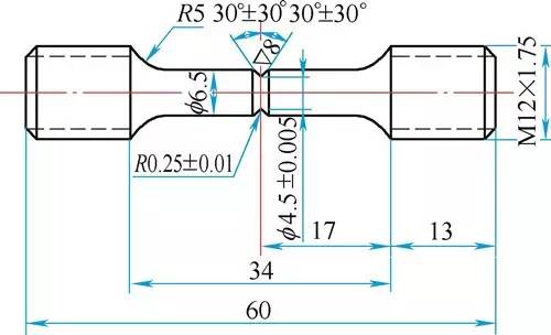 第三,試樣的制造。按圖沿材料的順纖維方向加工試樣,粗加工后熱處理至所要求的抗拉強度,然后精加工至規(guī)定尺寸,缺口用中軟細(xì)粒氧化鋁砂輪磨制。磨削時應(yīng)保證缺口根部半徑圓滑。磨削后投影檢查,確保缺口尺寸符合圖紙要求。逐根測量缺口根部直徑(圖中為φ4.5±0.05mm)的尺寸,并做好編號記錄。