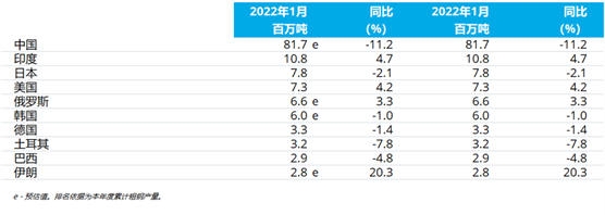 2022年1月粗鋼產(chǎn)量累計(jì)前十位的國(guó)家