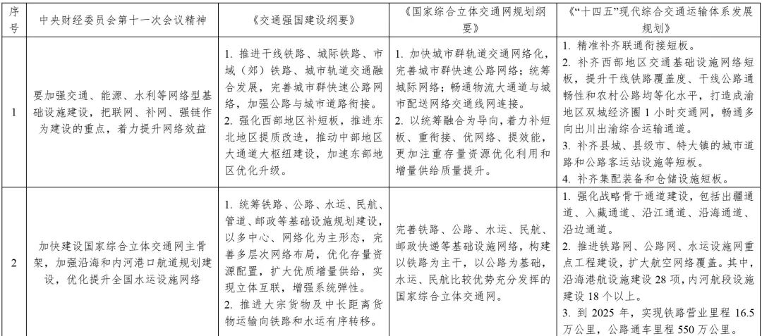 中央財(cái)經(jīng)委員會第十一次會議要求內(nèi)容與中共中央、國務(wù)院印發(fā)的《交通強(qiáng)國建設(shè)綱要》《國家綜合立體交通網(wǎng)規(guī)劃綱要》《“十四五”現(xiàn)代綜合交通運(yùn)輸體系發(fā)展規(guī)劃》等政策文件一脈相承,并有所側(cè)重,強(qiáng)化了交通、能源、水利、城鎮(zhèn)和科技等基礎(chǔ)設(shè)施在國內(nèi)國際雙循環(huán)相互促進(jìn)過程中的重要紐帶作用和產(chǎn)業(yè)鏈供應(yīng)鏈安全穩(wěn)定的保障基石作用,對構(gòu)建現(xiàn)代化基礎(chǔ)設(shè)施體系、推動經(jīng)濟(jì)高質(zhì)量發(fā)展具有重要指導(dǎo)意義。同時,兼顧了有序推進(jìn)地下綜合管廊建設(shè),加強(qiáng)城市防洪排澇、污水和垃圾收集處理體系建設(shè),加強(qiáng)防災(zāi)減災(zāi)基礎(chǔ)設(shè)施、公共衛(wèi)生應(yīng)急設(shè)施和國家安全基礎(chǔ)設(shè)施建設(shè);推進(jìn)重點(diǎn)水源、灌區(qū)、蓄滯洪區(qū)建設(shè)和現(xiàn)代化改造等內(nèi)容。表1為中央財(cái)經(jīng)委員會第十一次會議基礎(chǔ)設(shè)施建設(shè)有關(guān)內(nèi)容與相關(guān)政策文件對照。