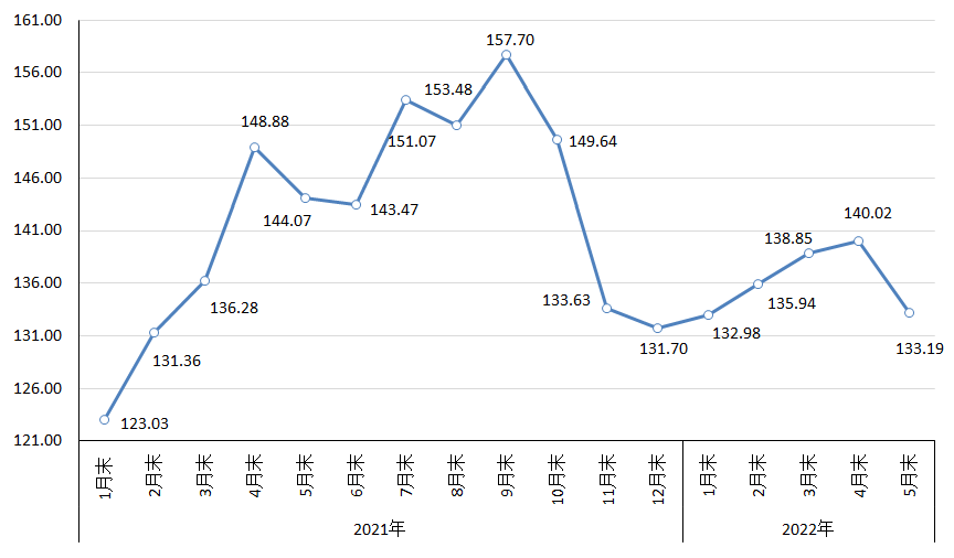 據(jù)鋼鐵協(xié)會監(jiān)測,5月末,中國鋼材價格指數(shù)(CSPI)為133.19點,環(huán)比由升轉(zhuǎn)降,下降6.83點,降幅為4.88%;同比下降10.88點,降幅為7.55%。(見下圖)