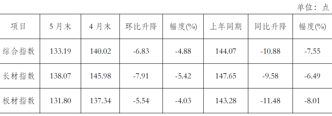 5月末,CSPI長材指數(shù)為138.07點,環(huán)比下降7.91點,降幅為5.42%;CSPI板材指數(shù)為131.80點,環(huán)比下降5.54點,降幅為4.03%。與上年同期相比,長材、板材指數(shù)分別下降9.58點和11.48點,降幅分別為6.49%和8.01%。(見下表)