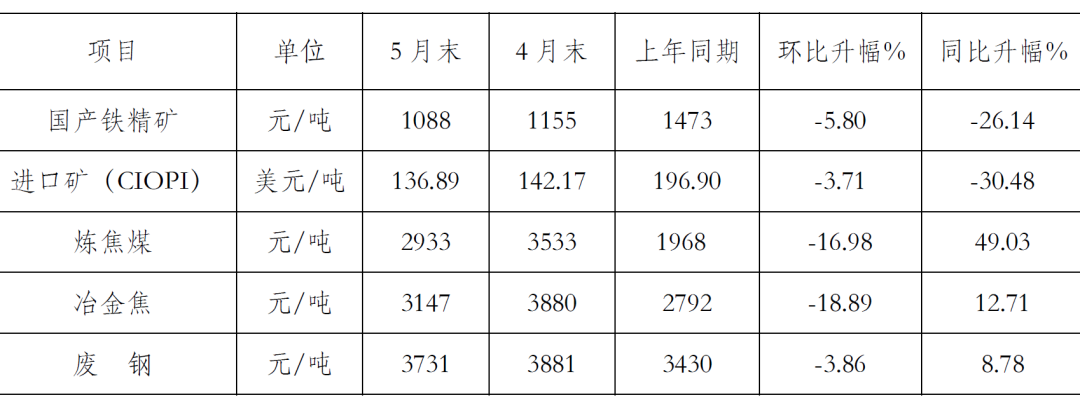 5月末,CIOPI進口礦價格環(huán)比下降5.28美元/噸,國產(chǎn)鐵精礦價格環(huán)比下降67元/噸;煉焦煤價格環(huán)比下降600元/噸,冶金焦價格環(huán)比下降733元/噸,廢鋼價格環(huán)比下降150元/噸。原燃料價格雖環(huán)比回落,但總體仍處于高位。(見下表)