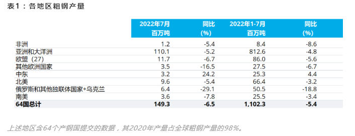 2022年7月全球64個(gè)納入世界鋼鐵協(xié)會(huì)統(tǒng)計(jì)國家的粗鋼產(chǎn)量為1.493億噸,同比下降6.5%。