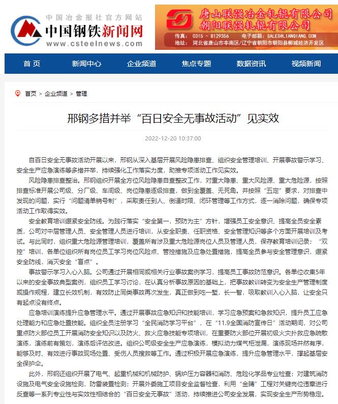 此外,邢鋼還組織開展了電氣、起重機械和機械防護、鍋爐壓力容器和消防、危險化學(xué)品專業(yè)檢查;對建筑消防設(shè)施及電氣安全設(shè)施檢測,防雷裝置檢測;開展外委施工項目安全監(jiān)督檢查,利用“金睛”工程對關(guān)鍵崗位違章進(jìn)行反查等一系列專業(yè)性與實效性相結(jié)合的“百日安全無事故”活動,持續(xù)推進(jìn)公司安全發(fā)展,實現(xiàn)安全生產(chǎn)形勢穩(wěn)定。