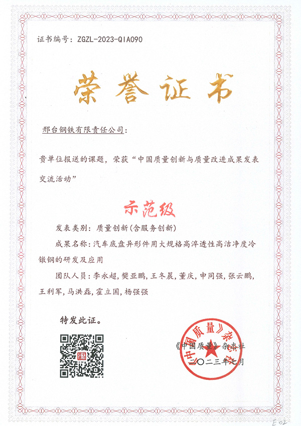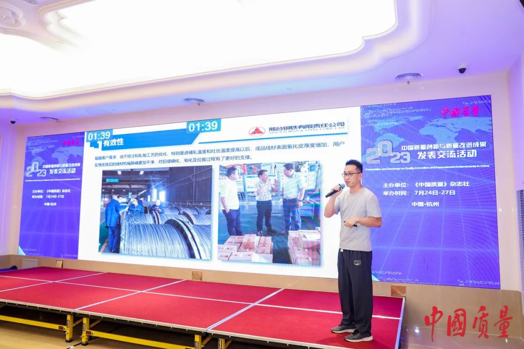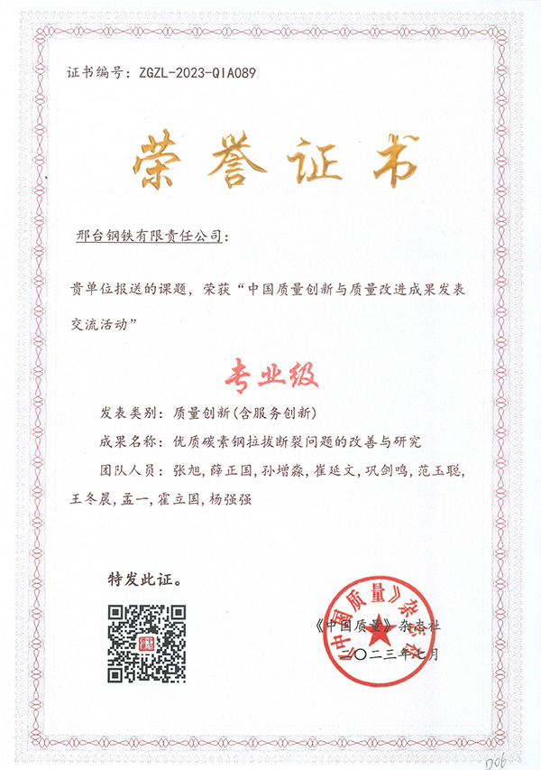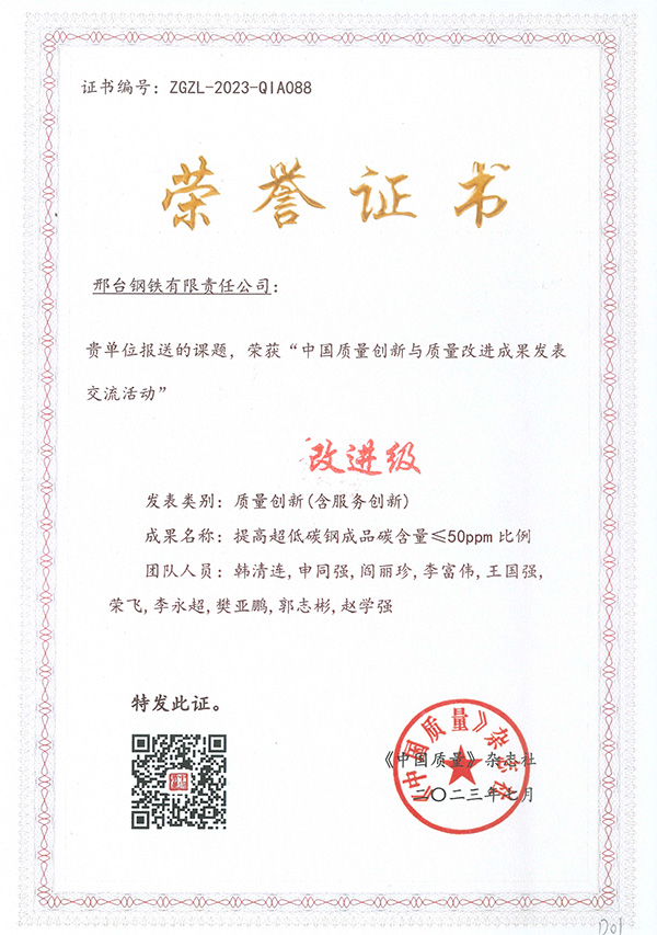 Recently, the "2023 China Quality Innovation and Quality Improvement Achievement Publishing and Exchange Activity" sponsored by China Quality Magazine successfully concluded in Hangzhou. More than 300 achievements from well-known enterprises in various industries such as power, tobacco, automobile, aviation, telecommunications, pharmaceuticals, steel and so on across the country were shortlisted for the competition. The Xingtai Steel delegation won many honors in this event, including: the achievement of "Research and Application of Large-sized High-hardenability and High-cleanliness Cold-heading Steel for Automobile Chassis Special-shaped Parts" was awarded the honor of "Demonstrative Level", the achievement of "Improvement and Research on the Drawing Fracture Problem of High-quality Carbon Steel" was awarded the honor of "Professional Level", and the achievement of "Improving the Ratio of Ultra-low Carbon Steel Finished Product Carbon Content ≤ 50ppm" was awarded the honor of "Improvement Level".