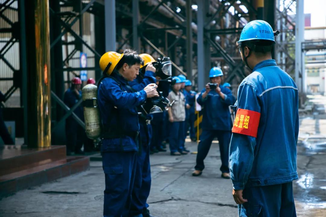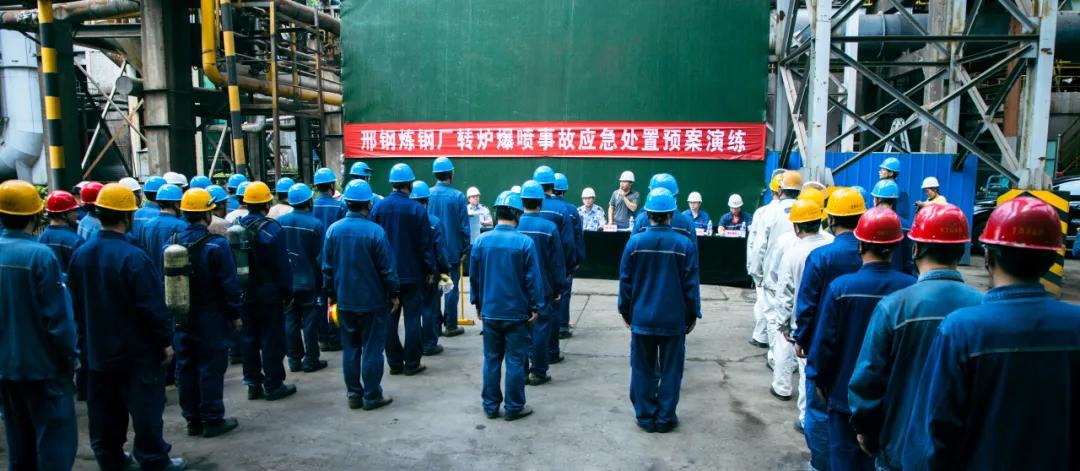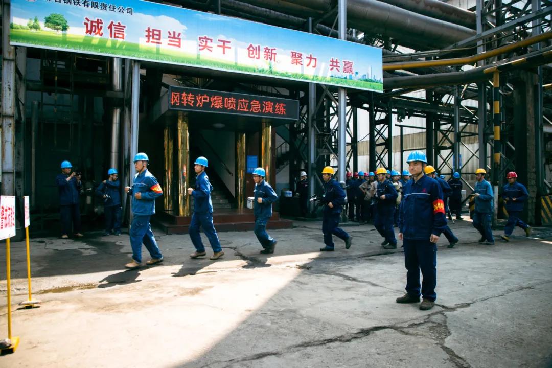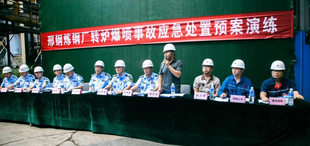 隨后,參會(huì)人員一起現(xiàn)場(chǎng)觀摩了邢鋼高溫熔融金屬爆噴事故現(xiàn)場(chǎng)應(yīng)急處置演練。本次演練,模擬煉鋼廠(chǎng)加料跨天車(chē)向2#轉(zhuǎn)爐加廢鋼時(shí)發(fā)生爆噴為背景,演示了事故上報(bào)、安全疏散、預(yù)案啟動(dòng)、現(xiàn)場(chǎng)搶險(xiǎn)、應(yīng)急救援等環(huán)節(jié)。