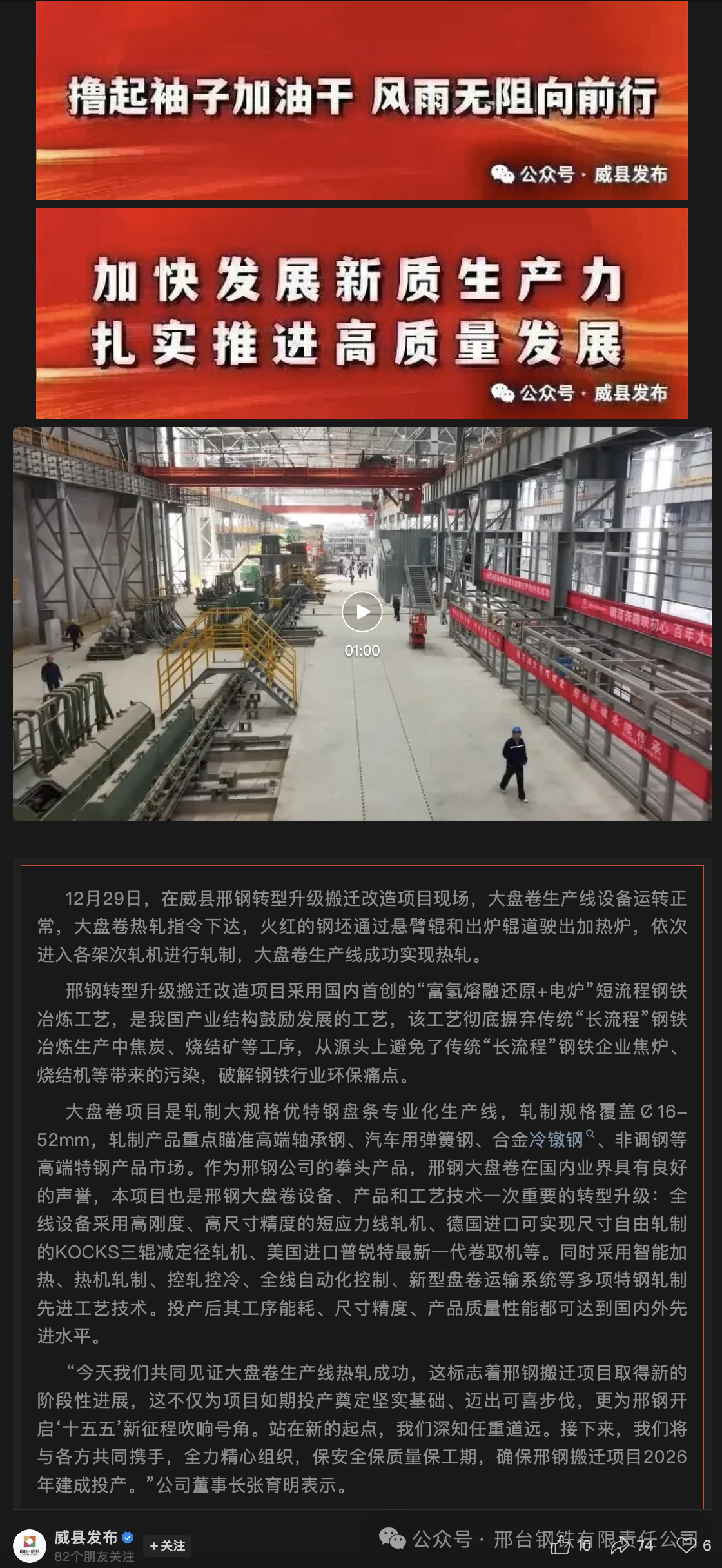 “今天我們共同見(jiàn)證大盤(pán)卷生產(chǎn)線(xiàn)熱軋成功,這標(biāo)志著邢鋼搬遷項(xiàng)目取得新的階段性進(jìn)展,這不僅為項(xiàng)目如期投產(chǎn)奠定堅(jiān)實(shí)基礎(chǔ)、邁出可喜步伐,更為邢鋼開(kāi)啟‘十五五’新征程吹響號(hào)角。站在新的起點(diǎn),我們深知任重道遠(yuǎn)。接下來(lái),我們將與各方共同攜手,全力精心組織,保安全保質(zhì)量保工期,確保邢鋼搬遷項(xiàng)目2026年建成投產(chǎn)。”公司董事長(zhǎng)張育明表示。